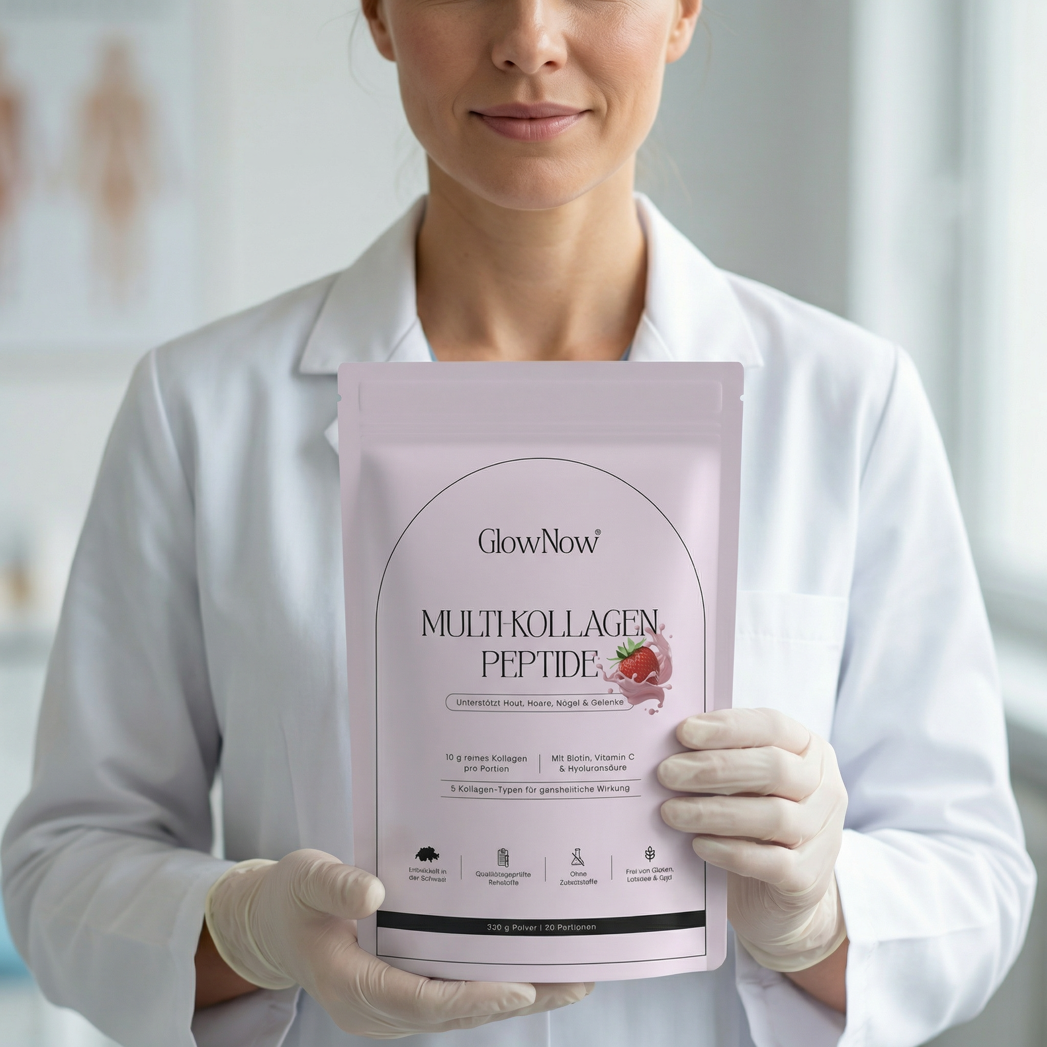 GlowNow® setzt auf einen 5-fach Multi-Kollagen-Komplex (Typ I–V), ergänzt mit Vitamin C, Biotin und Hyaluronsäure.